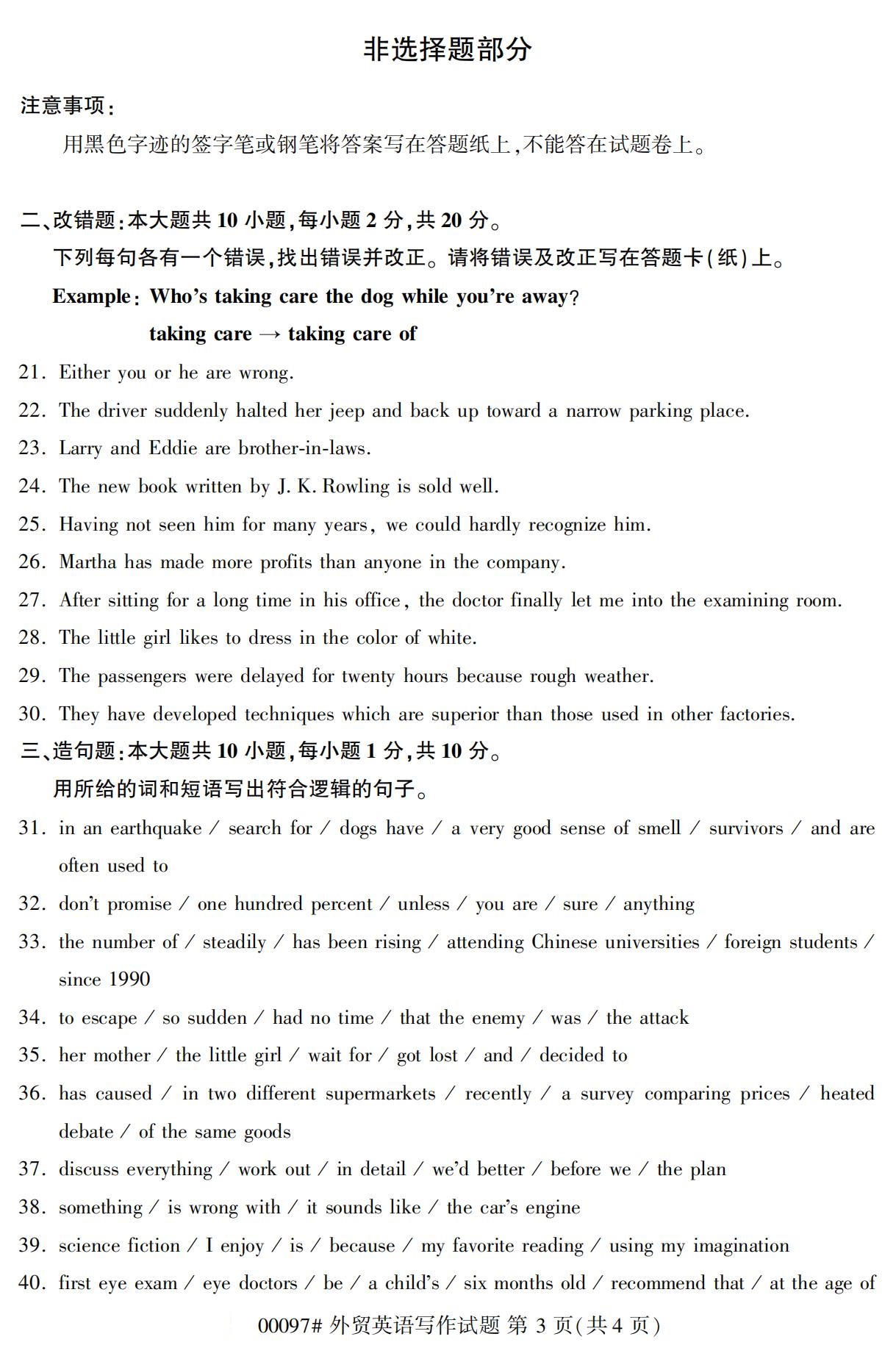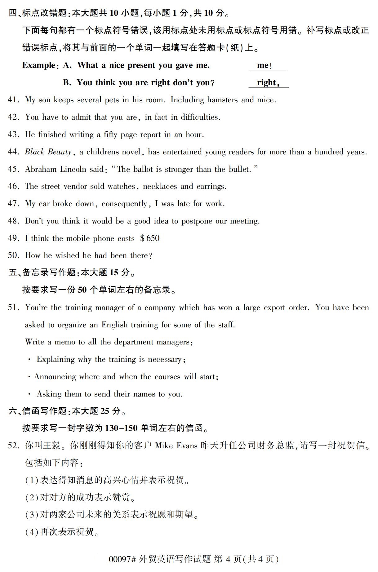 【结尾】以上是2022年10月辽宁自考00097外贸英语写作真题试卷的简要介绍,如想查看更多内容记得查看:辽宁自考解答、自考本科、自考专业、自考复习备考等相关资讯。