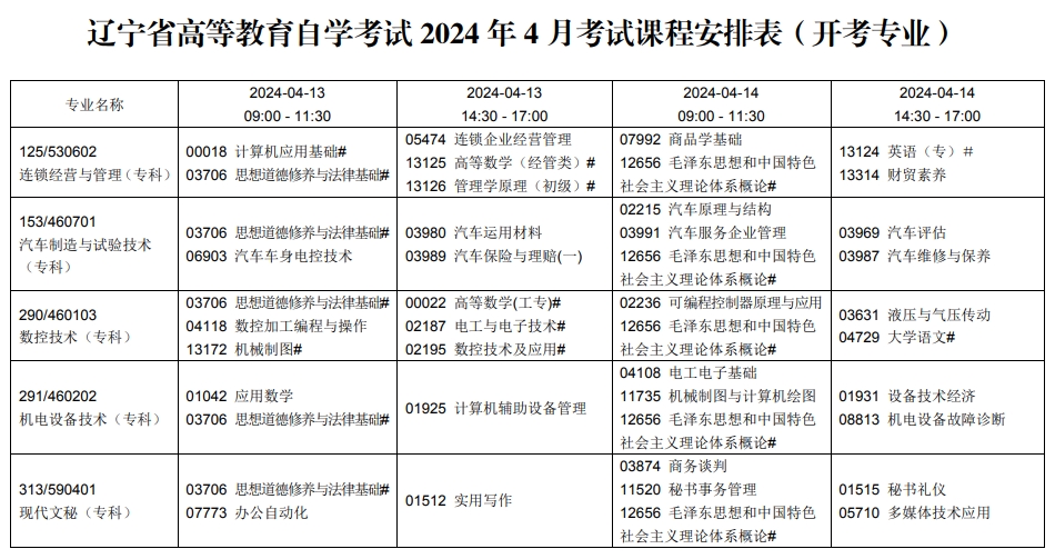 【导读】2024年4月辽宁自考考试课程安排表(开考专业)已发布,报考了4月辽宁自考的考生可以关注一下哦,以下为辽宁自考考试安排。