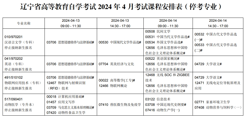 2024年4月辽宁自考考试安排表(停考专业)