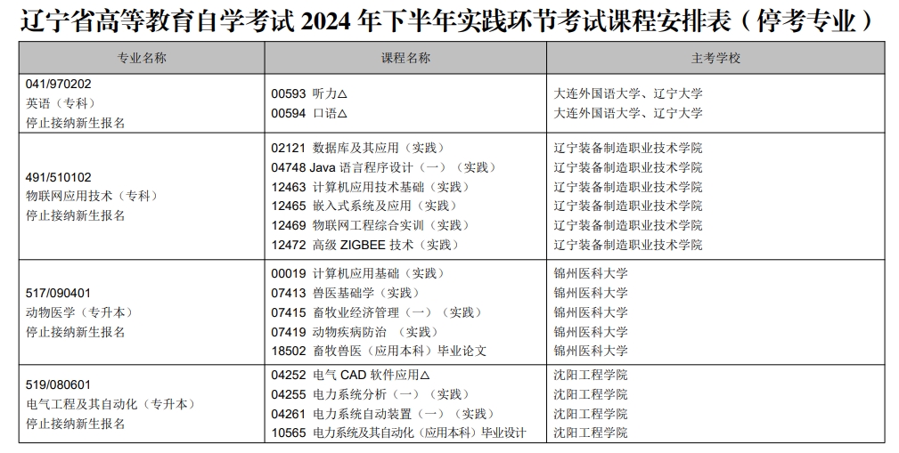 2024年下半年辽宁自考实践环节考试课程安排表(停考专业)
