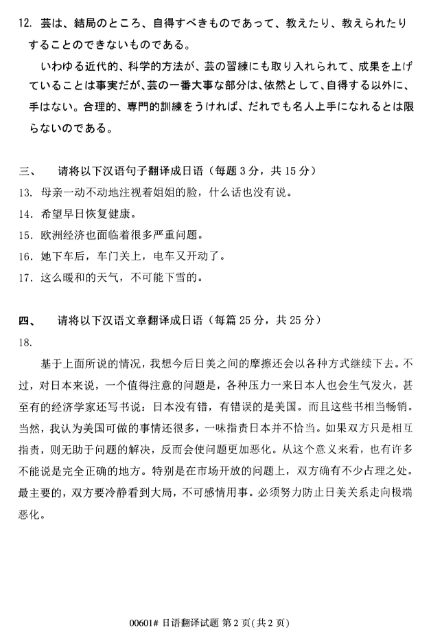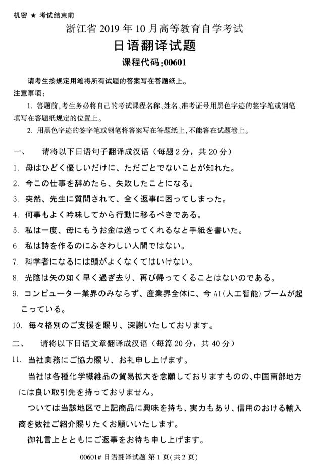 2019年10月全国自考日语翻译真题