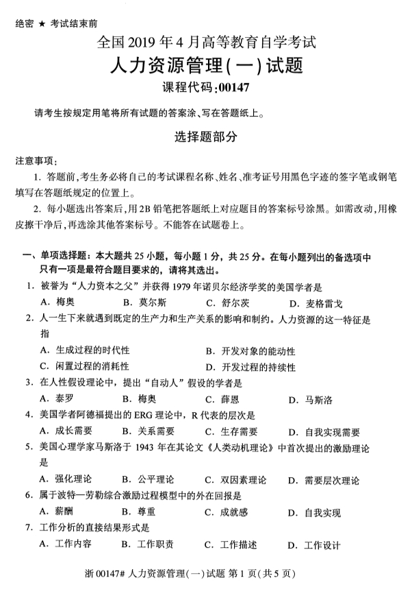 • 所在位置:辽宁自学考试网 > 自考试卷 > 2019年4全国自考人力资源管理(一)真题