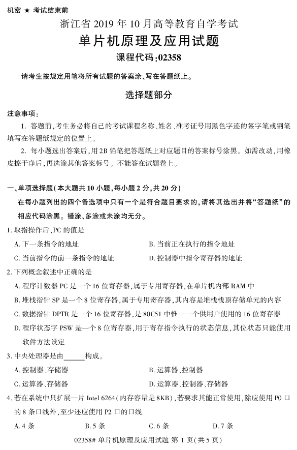 • 所在位置:辽宁自学考试网 > 自考试卷 > 2019年10月全国自考单片机原理及应用真题