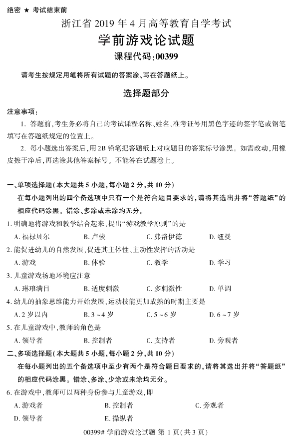 • 所在位置:辽宁自学考试网 > 自考试卷 > 2019年4月全国自考学前游戏论真题