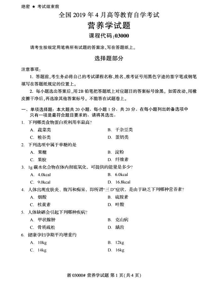 • 所在位置:辽宁自学考试网 > 自考试卷 > 2019年4月全国自考营养学真题