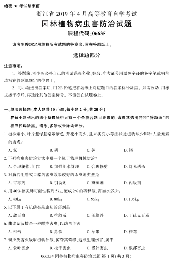 • 所在位置:辽宁自学考试网 > 自考试卷 > 2019年4月全国自考园林植物病虫害防治真题