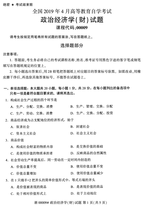 • 所在位置:辽宁自学考试网 > 自考试卷 > 2019年4月全国自考政治经济学(财)真题