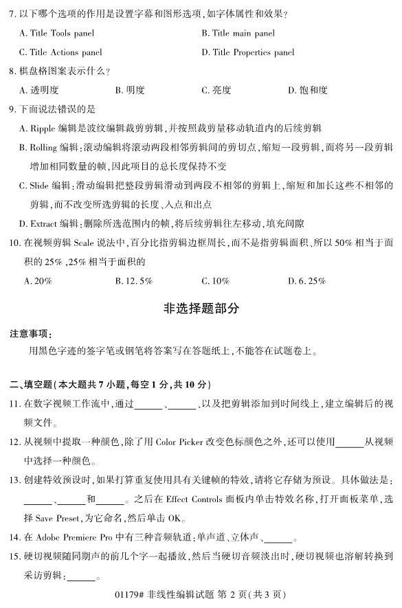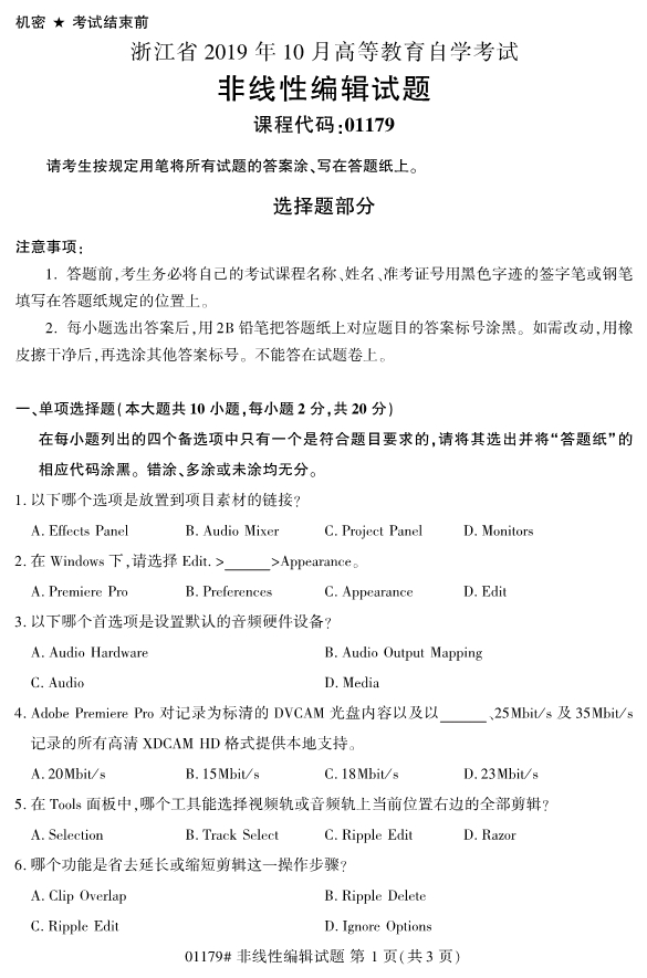 2019年10月全国自考非线性编辑真题