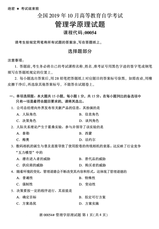 • 所在位置:辽宁自学考试网 > 自考试卷 > 2019年10月全国自考管理学原理真题