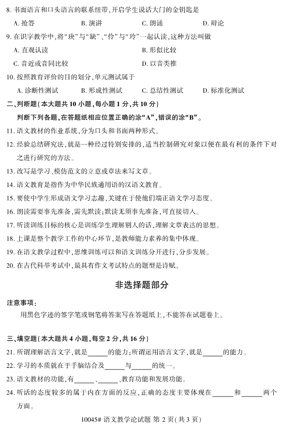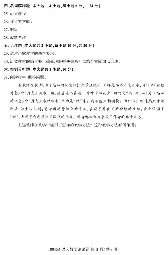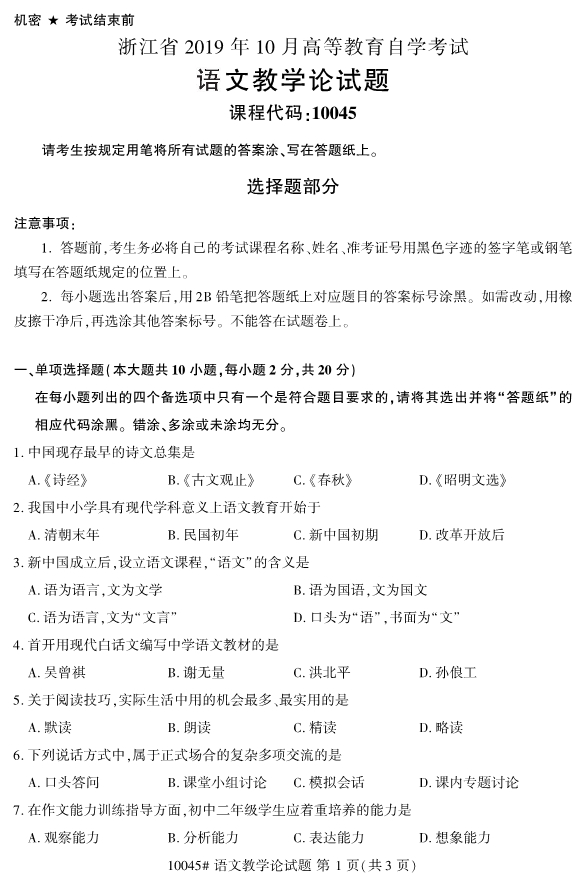 • 所在位置:辽宁自学考试网 > 自考试卷 > 2019年10月全国自考语文教学论真题